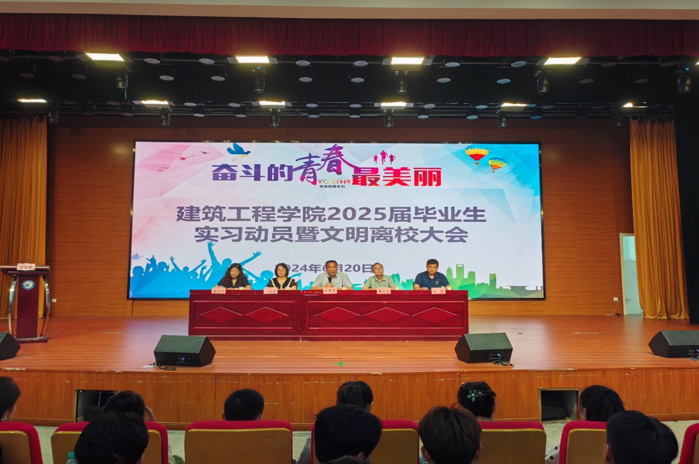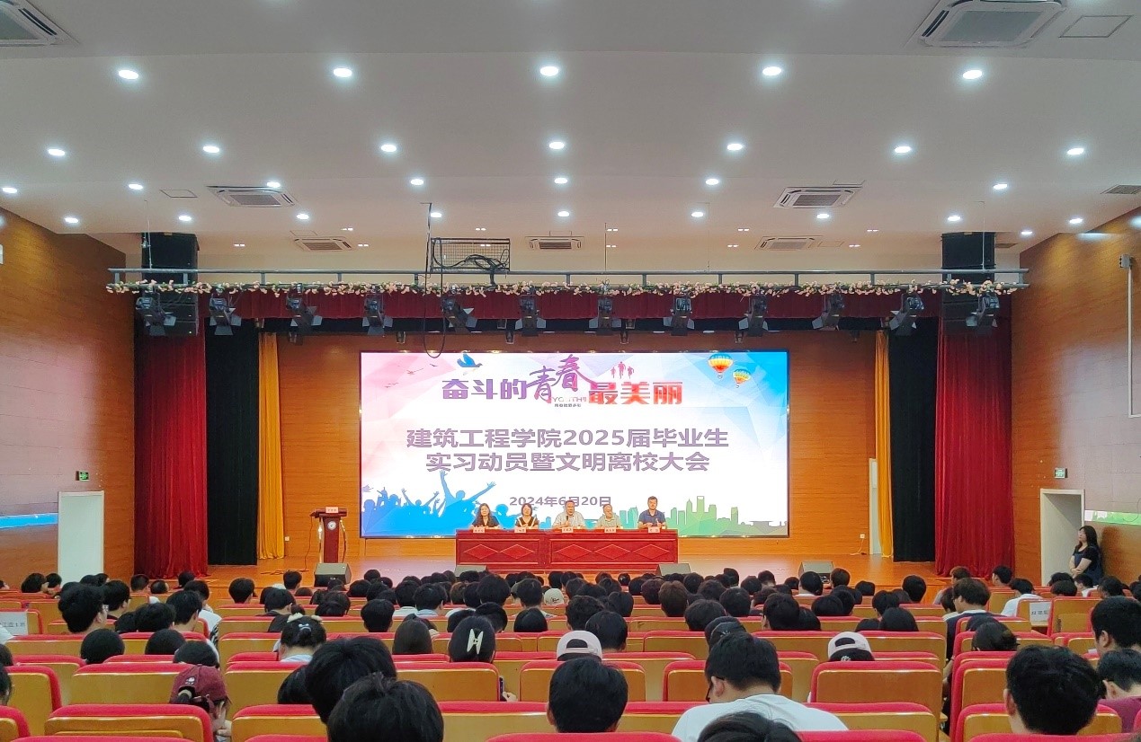 随后,副院长邓勋对学院2025届学生顶岗实习时间、实习形式、实习过程管理、实习考核与成绩评定等方面作了具体布置和要求。魏永恒对即将进入顶岗实习的同学们作总体要求:第一要勤学勤问,认真学习实践知识;第二要注意纪律,遵守实习现场的规章制度;第三要确保安全,提高自身的风险防范意识。党总支副书记施芳芳要求全体同学做好文明离校工作。22建工2班王政同学代表全体实习生发言。
