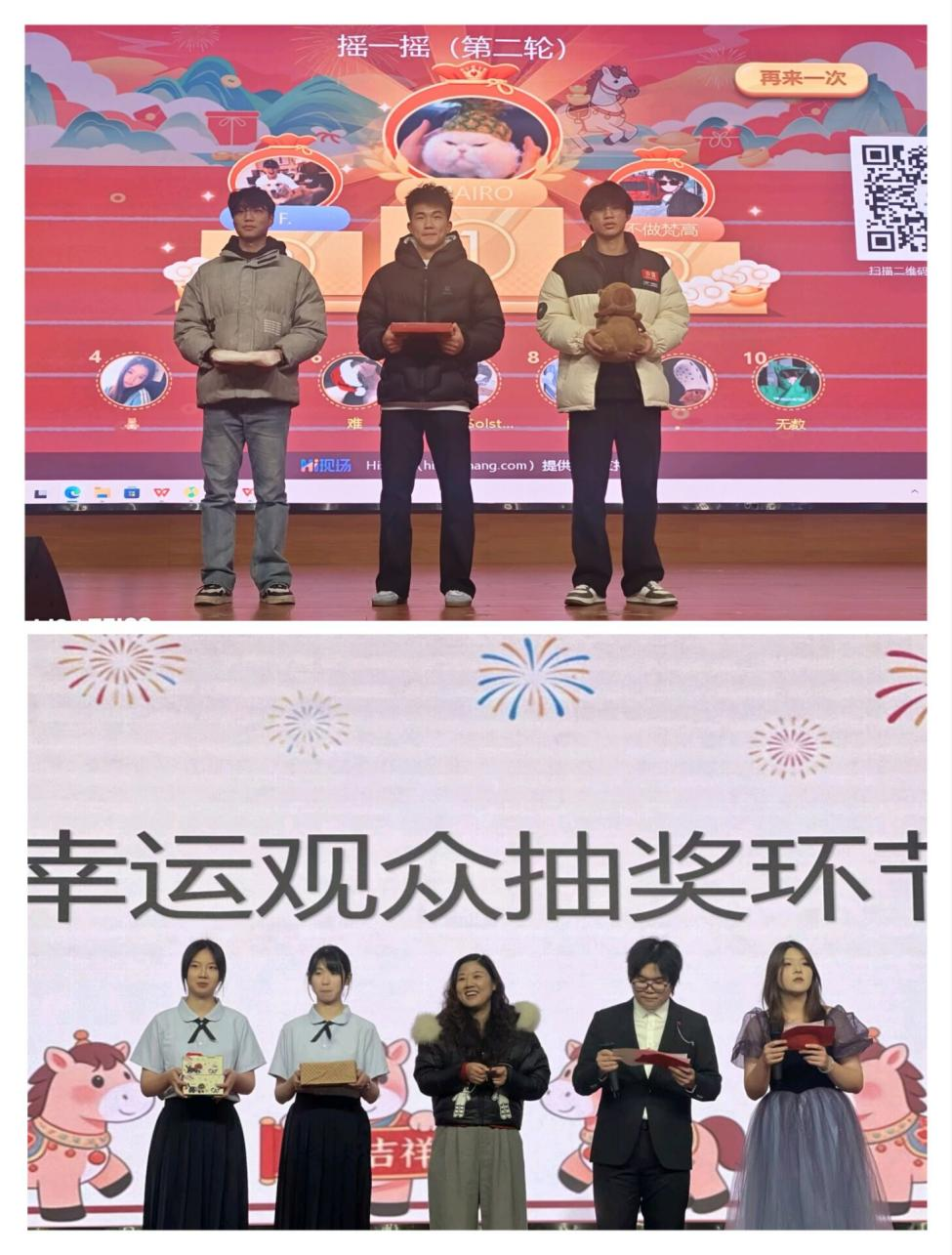 晚会还设置了“趣味摇一摇”互动和幸运观众抽奖环节,台下学子踊跃参与,将现场氛围一次次推向高潮。beat365英国官网第十届学生会带来的《猪猪侠》特别节目,更是让晚会充满了欢乐的氛围。台下观众热情高涨,挥舞着手中的荧光棒,不时响起阵阵掌声与欢呼声,现场暖意融融、其乐融融,处处洋溢着喜庆祥和的节日氛围。