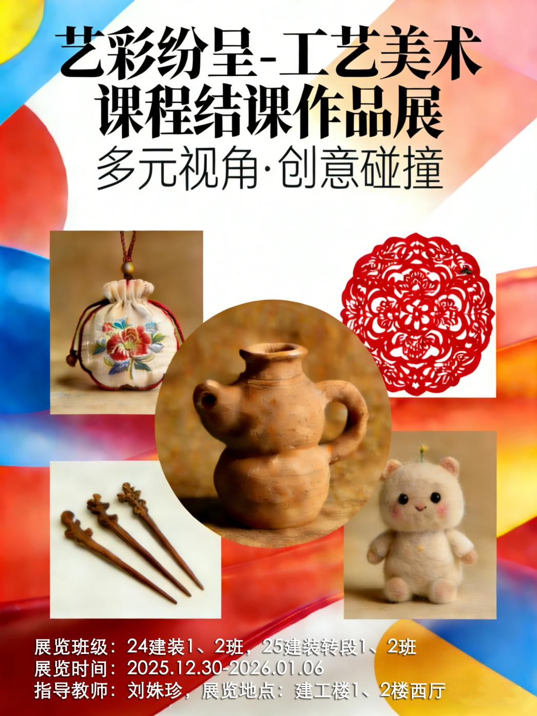 2025年12月30日至2026年1月6日,beat365英国官网建筑装饰工程技术专业24级1、2班及25级转段1、2班《工艺美术》课程结课展览在建工楼一楼、二楼展厅拉开帷幕。此次展览由刘姝珍老师指导,分纸艺和综合材料两大展区,百余件学生作品集中亮相,吸引众多师生驻足观赏,感受传统工艺的底蕴与当代设计的活力。