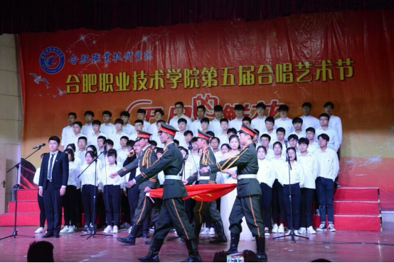 合唱比赛中,17工造3、4班组成的“自强队”的有志青年们昂首挺胸、目光如炬,舞台一侧,四位军装青年手持国旗,此时国旗如火般在他们的手中闪闪发光。