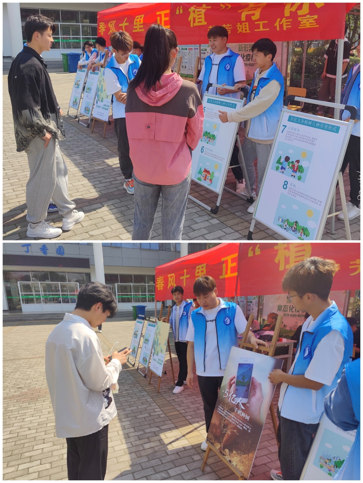 活动现场,许多路过的同学都会驻足观看,了解义务植树的尽责形式,有的同学更是当场就打开手机,在志愿者的指导下开始加入线上植树活动。