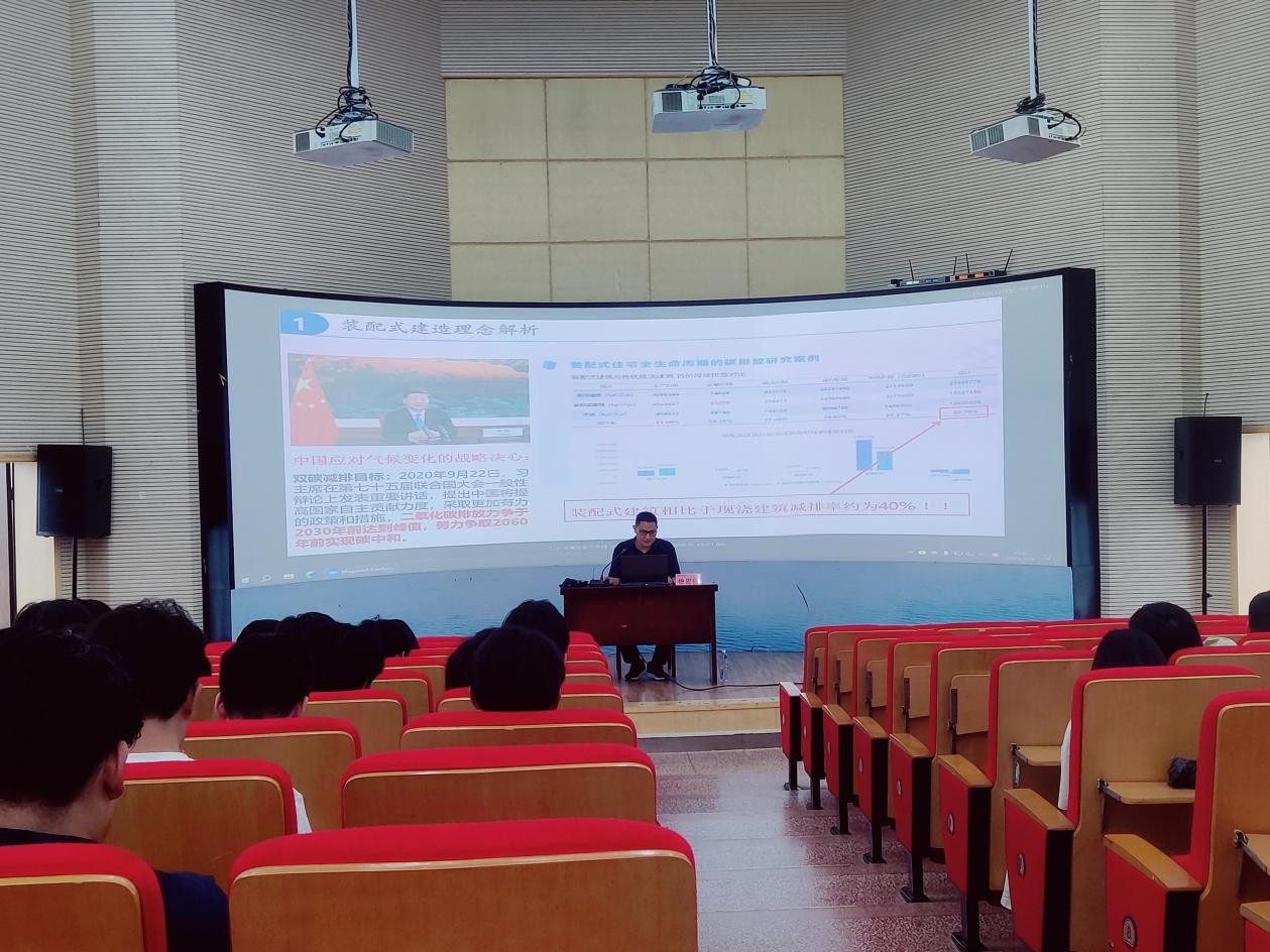 杨宏伟从装配式建造理念切入,通过对比现浇结构与装配式结构的差异,结合国家“双碳”战略目标,生动阐释了“像造汽车一样造房子”的工业化建造理念,系统梳理了装配式建筑在国家、安徽省及合肥市三级政策推动下的发展历程,重点解读了合肥市“1+5”特色建造模式的实践成果。在技术分享环节,杨宏伟详细讲解了标准化设计、工厂化生产、装配化施工等智能建造策略,深入剖析了等同现浇技术、BIM应用等七大关键技术体系,特别介绍了合肥市装配式建造特色的十项质量管理制度。讲座内容紧扣行业前沿,理论与实践并重,现场反响热烈。同学们纷纷表示,通过讲座不仅拓宽了对智能建造技术的认知,更深刻体会到绿色低碳理念在建筑工业化中的实践价值。