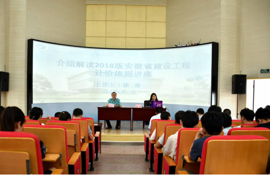 为了我校建筑类专业学生把握建设工程造价行业的最新动态,2018年6月13日下午,由校宣传部、beat365英国官网共同主办的素质大讲堂,邀请了安徽省建筑设计院教授级高级工程师、英国皇家测量师、国家注册造价师、2018年安徽省建设工程计价依据编制人姜葵教授在学校图书馆二楼报告厅做了一场“解读2018版安徽省建设工程计价依据”专题讲座,讲座由我院魏永恒副院长主持,我院范家茂院长出席,部分专业教师以及即将走上实习岗位的2016级建筑类专业学生参加讲座。