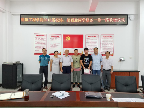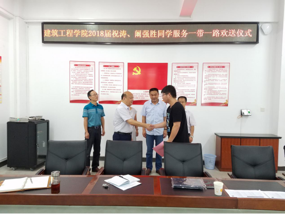 合肥建工集团结合实习期间表现并通过层层遴选,将我院2018届“合肥建工班”阚强胜、祝涛两名同学抽选赴合肥建工集团马来西亚碧桂园项目部工作。为此2018年7月5日上午,我院在综合实训楼会议室举行2018届阚强胜、祝涛两位同学赴合肥建工集团马来西亚项目欢送仪式,校党委委员副校长周晓隆出席欢送仪式,院班子成员及相关辅导员班主任参加。