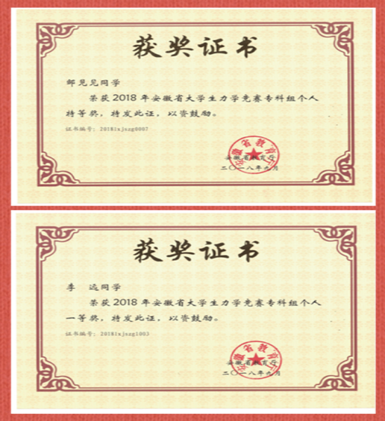 2018年10月27日,在合肥工业大学屯溪路校区召开2018年安徽省大学生力学竞赛总结会议。我院学子共获得6个奖次:2015级工程造价2班邹见见同学获得专科组个人特等奖,2016级建筑工程技术2班李远同学获得专科组个人一等奖,另有4名同学获得专科组个人三等奖。