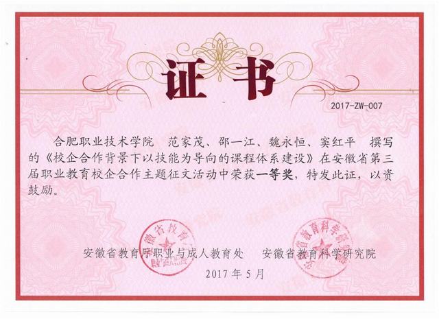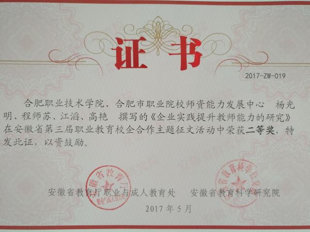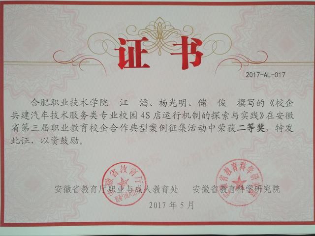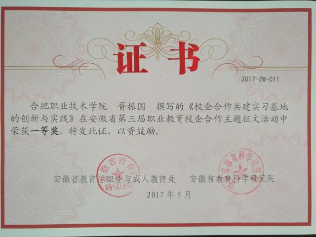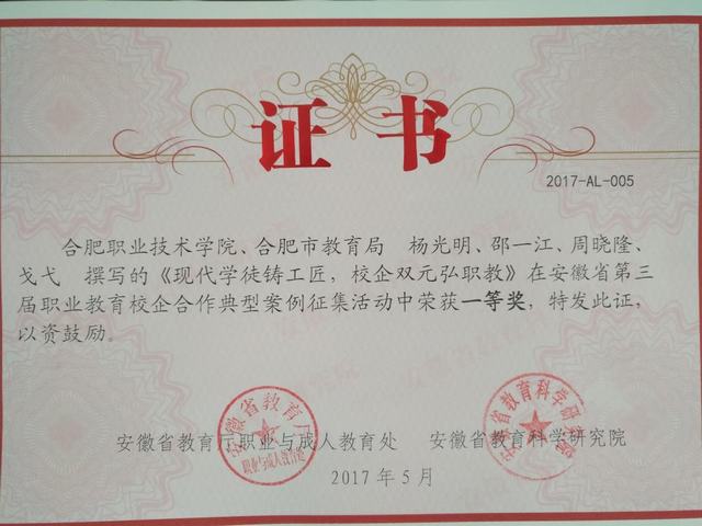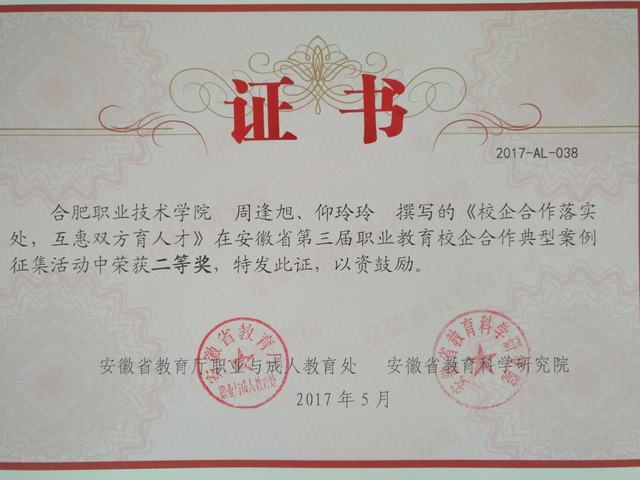 日前,在安徽省教育厅、安徽省教育科学研究院联合举办的“第三届安徽省职业教育校企合作典型案例征集和主题征文”评选中,我校选送的8篇作品取得了3个一等奖,3个二等奖,2个三等奖的优异成绩。