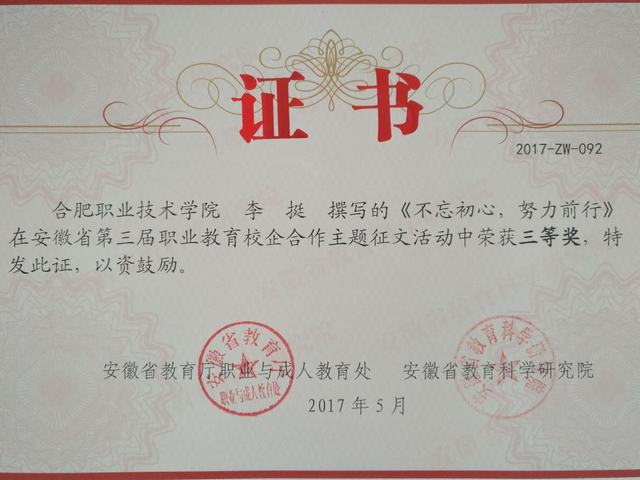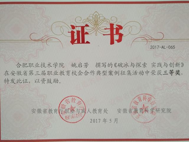 我校在“第三届安徽省职业教育校企合作典型案例征集和主题征文”活动中取得优异成绩
