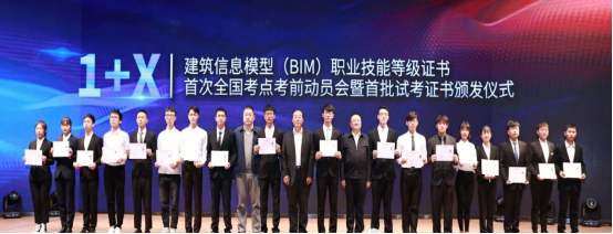 2019年11月6日,我院魏永恒副院长带队参加在河北廊坊召开“1+X”建筑信息模型BIM职业技能等级证书首次全国考点考前动员会暨首批试考证书颁发仪式,来自住房和城乡建设部、全国住房和城乡建设职业教育教学指导委员会、中国建设教育协会的相关负责人和272所院校的550余名教师参加了会议。会上,为来自全国18所职业院校BIM证书上00001的学生颁发“1+X”建筑信息模型(BIM)职业技能等级证书,这是国家职业教育改革“1+X”证书制度试点工作开展以来全国发放的首批证书。