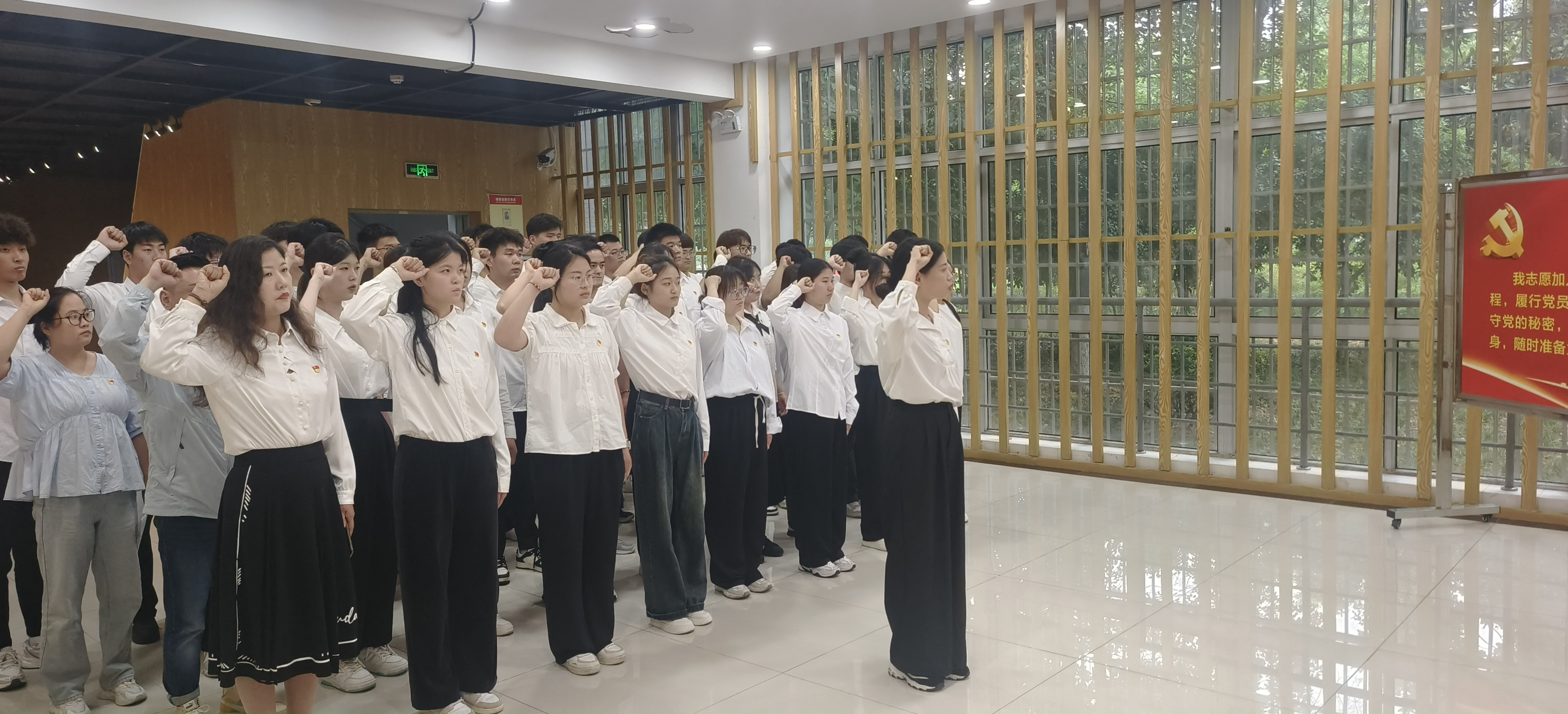 转正会议结束后,39名转正党员在建工楼一楼大厅重温了入党誓词,胡文胜同志代表39名转正党员发言,表达了对党的深厚情感和为党的事业奋斗终身的决心。党总支副书记施芳芳同志代表院党总支向39名同志顺利转为正式党员表示热烈的祝贺,并提出三点要求:一是不断坚定理想信念,努力提高政治站位;二是持续加强理论学习,着力提升党性修养;三是始终牢记入党誓词,时刻践行初心使命。
