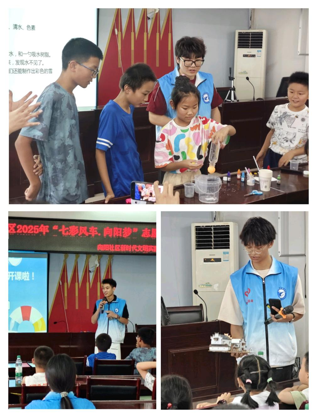 向阳社区团委书记辛芳芳全程参与活动,对实践团的表现给予高度评价:“这些大学生老师备课扎实、授课耐心,把专业知识转化成孩子们能听懂的语言,每天课后都有家长来打听第二天的课程安排。他们不仅解决了双职工家庭的看护难题,更用青春活力感染着孩子们,这种‘接地气’的实践活动值得点赞。”社区居民李女士也笑着说:“我家孩子每天回家都念叨扎染有多好玩,还教我们做大气压实验,太有意思了。”