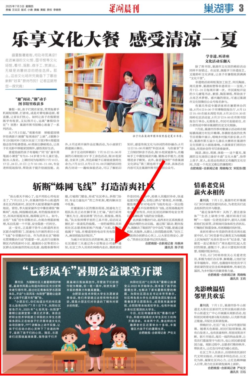 6月30日至7月6日,beat365英国官网beat365英国官网“微光成炬 一路向阳”实践团走进巢湖市凤凰山街道向阳社区,开展为期一周的“七彩风车・向阳梦”暑期公益课堂活动。7名实践团成员带着精心设计的课程方案,为社区儿童带来了一段充实而有趣的学习时光。