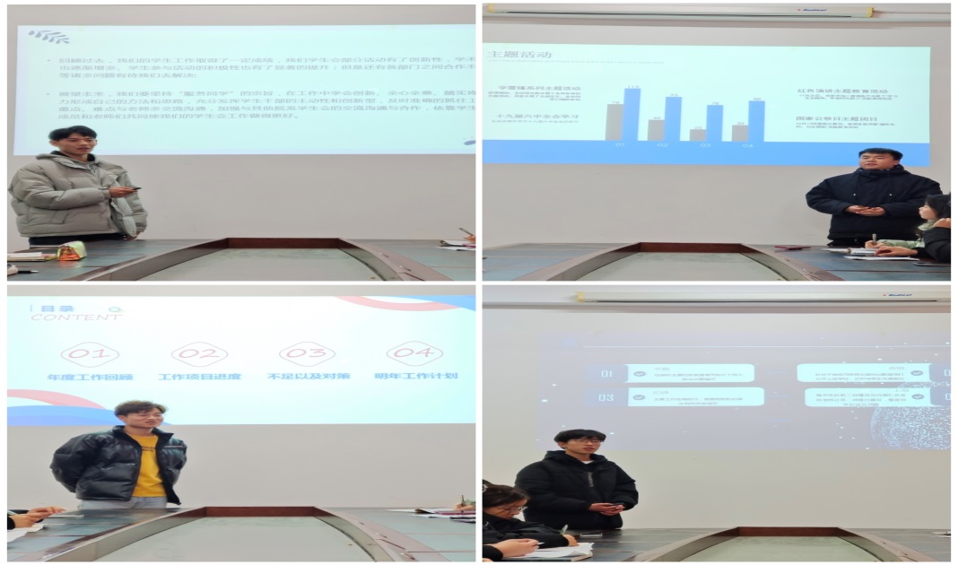 首先,学生会主席团三位主席就自己分管的工作分别做总结汇报,以时间为线索展示了本学期举办和协办的各项活动,围绕工作内容进行深入思考,不仅明确了工作中的得与失,而且总结经验指出了未来工作的改进方向。