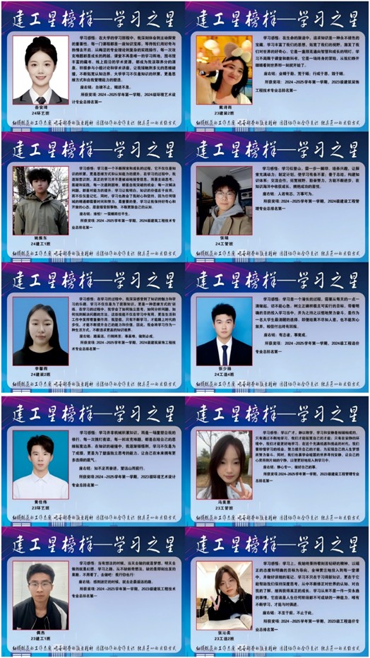 为表彰先进典型,激发学生学习热情,营造 "比学赶超" 的浓厚氛围,beat365英国官网开展“建工星榜样——学习之星”评选活动,根据2024-2025学年第一学期学业成绩,评选出2023级和2024级各专业总分第一名,共十名优秀学生获得“学习之星”荣誉称号,并于3月3日在教学C楼进行海报展示。