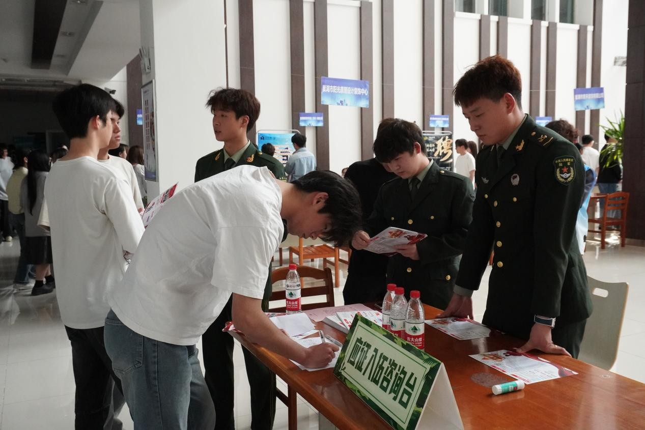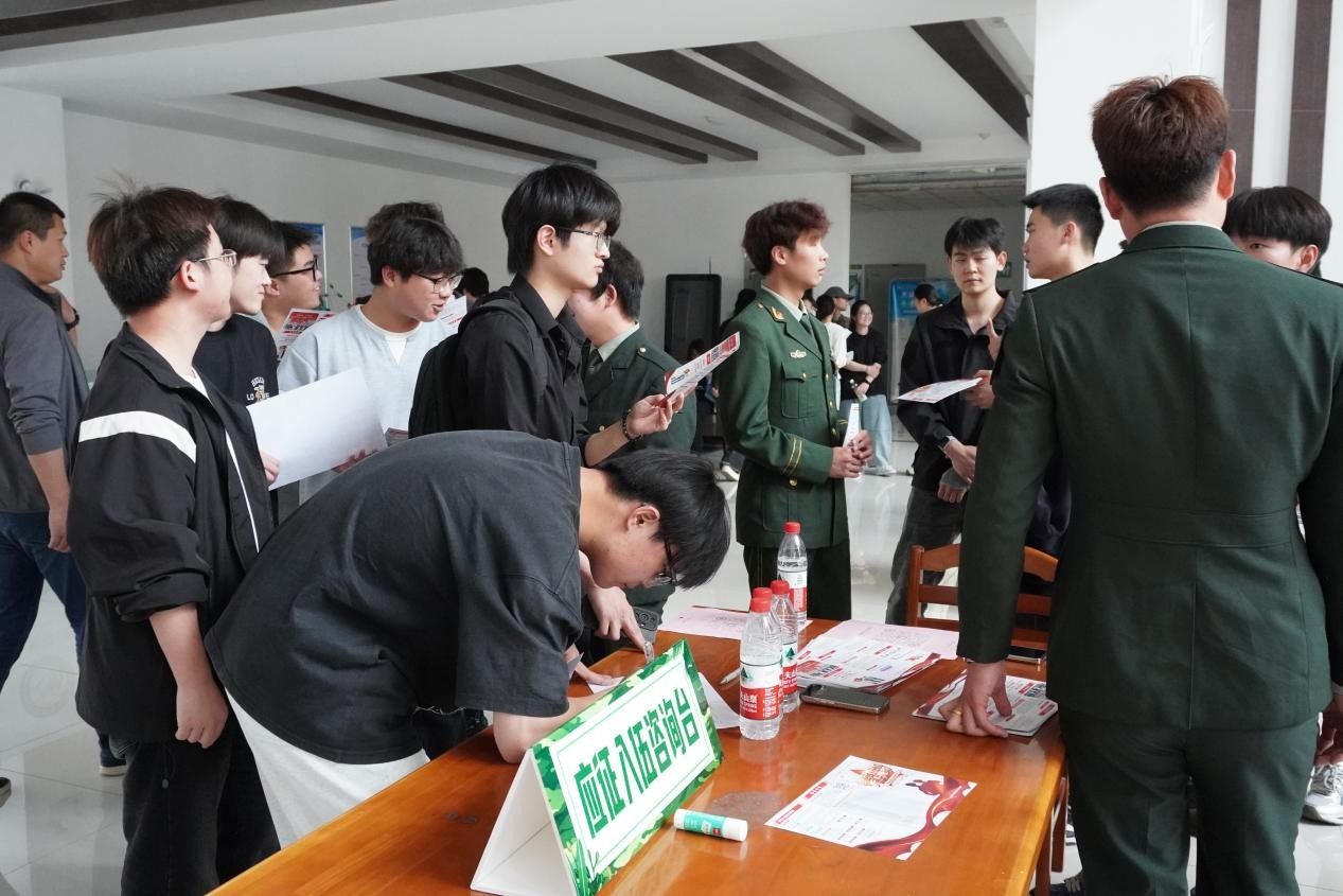 为鼓励大学生积极参军应征入伍,提高兵员征集质量,推进国防和军队现代化建设,4月23日下午,beat365英国官网学工办在学院2025年春季就业实习双选会现场设立应征入伍咨询台,开展征兵政策宣传活动。