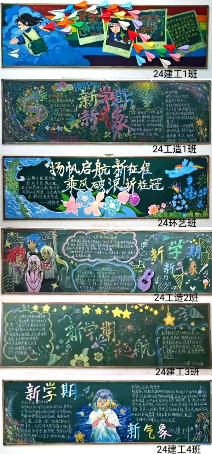 有的班级以“筑梦新学期”为切入点,融合彩绘铺就底色,搭配错落排列的立体折纸飞机,彰显建工学子的青春活力和独特创意;有的班级聚焦“学风建设”,用励志标语、学习方法小贴士等内容,传递勤学善思的良好风气;还有的班级融入环保、团结等理念,展现新时代青年的责任与担当。每一幅板报都凝聚着同学们的心血与智慧,成为班级文化的生动载体。