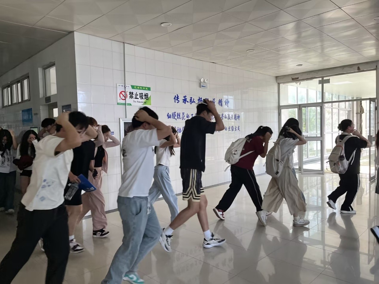 15时40分,随着警报声响起,演练正式启动。避险阶段:一层教室学生迅速弯腰护头,就近躲避于课桌下方;二层教室学生则按预案形成“三角区”防护姿态,远离玻璃窗和悬挂物。疏散阶段:警报间隔期,学生在辅导员引导下沿预定路线撤离。楼梯转角处,由学生志愿者组成的“安全员”指引方向,提醒“不推挤、不折返”。全体人员迅速完成集结。