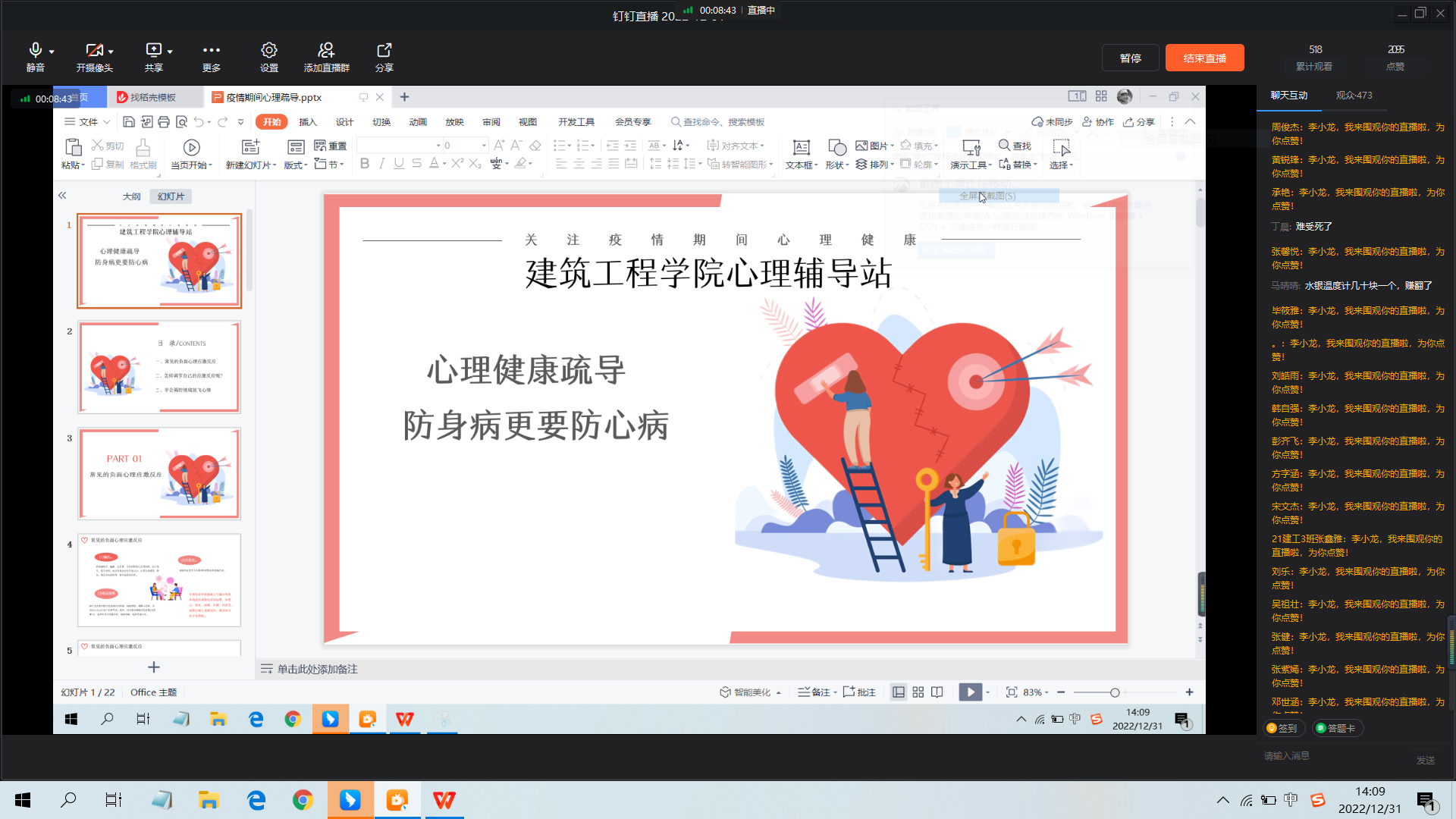 在新冠疫情防控的新形势下,为缓解学生面对奥密克戎来袭的心理压力,调适紧张和焦虑情绪,提高学生对因疫情而出现心理问题的应对技巧,12月31日下午,beat365英国官网组织开展了线上心理疏导讲座,由beat365英国官网心理老师李小龙担任主讲,21级和22级全体学生观看了此次讲座。